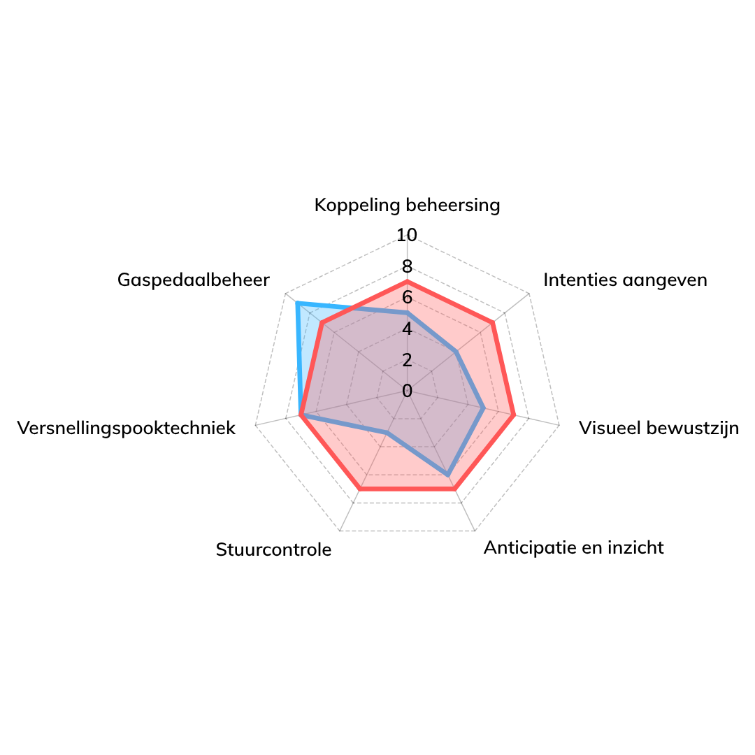 Na elke rit ontvang je een inzichtelijke, op data gebaseerde beoordeling van je rijles. Je ziet precies welke vaardigheden goed gingen en waar nog ruimte zit voor verbetering.